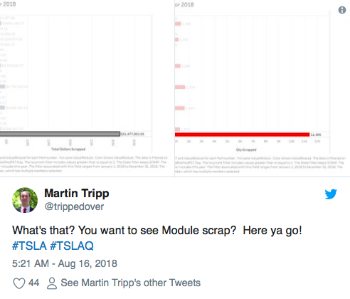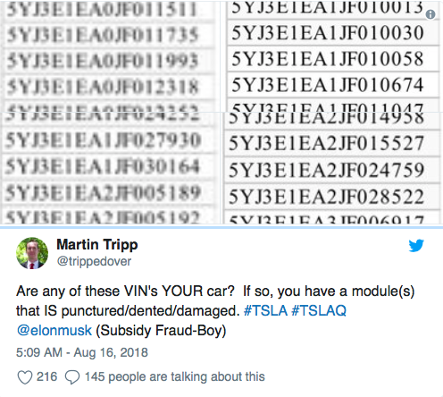 Tripp表示特斯拉的超級(jí)工廠在制造工藝上走了危險(xiǎn)捷徑,而馬斯克對(duì)此是直接知情的,但并未進(jìn)行干預(yù)。他在推文中寫道,列出的車輛識(shí)別號(hào)碼指的是采用了受損電池的具體車輛,這些受損電池根本不應(yīng)當(dāng)被安裝在車輛中。這是一系列推文中的第一條: