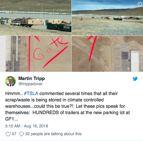 Tripp還在推特上發(fā)布了一些照片,聲稱特斯拉將廢物廢料存放在超級(jí)工廠的露天停車場(chǎng)和卡車上,而不是在溫控倉(cāng)庫(kù)里。他還分享了一些截圖,表示工廠內(nèi)有大量廢料。