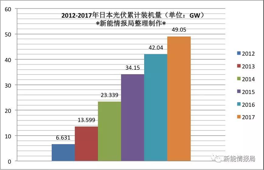 截止2017年底,日本光伏累計裝機量為49.051GW,其中并網(wǎng)項目48.88GW,離網(wǎng)項目為0.171GW。而2012年日本光伏累計裝機量僅為6.631GW。