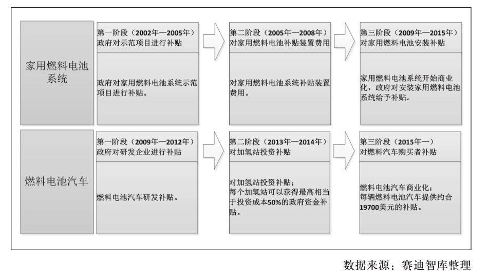 2002年,日本提出將燃料電池用作家用電源和汽車動力源,要求政府有關部門率先購入燃料電池車。2005年起,日本政府對家用燃料電池熱電聯(lián)供項目進行補貼,到2008年,共有3300套家用燃料電池安裝和使用。