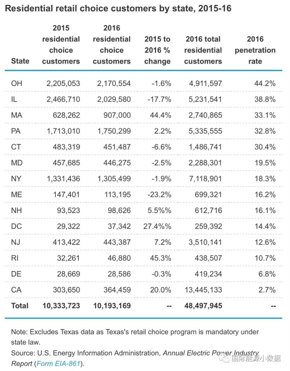 中國儲能網(wǎng)訊:美國電力市場售電側實現(xiàn)了競爭,居民用電戶可以從當?shù)氐呐潆姽举I電,也可以自由選擇供電商(只有德克薩斯法定必須參與自由選擇供電商)。到2016年有1019.3戶選擇了售電商,占美國全國用戶總數(shù)的7.8%(2014年這一比例曾達到8.9%)。