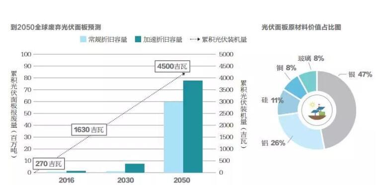 根據(jù)中科院電工所的預(yù)測,如果組件運營維護良好,到 2034 年國內(nèi)光伏組件累計廢棄量將達到近 60 吉瓦;而如果運維一般,屆時累計廢棄量將超過70吉瓦。而70吉瓦,已經(jīng)超過2017年光伏累積裝機量的1/2。而美國能源信息署的分析數(shù)據(jù)顯示,到2050年,中國光伏組件中或?qū)⒂?/3需要提前退役。