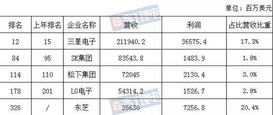 中國(guó)儲(chǔ)能網(wǎng)訊:在《財(cái)富》發(fā)布的2018世界500強(qiáng)榜單中,三星電子、SK集團(tuán)、松下集團(tuán)、LG電子、東芝5家企業(yè)涉足動(dòng)力電池領(lǐng)域。以下為5家企業(yè)營(yíng)收情況: