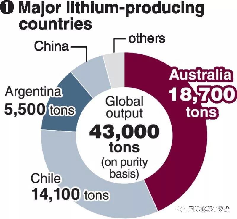 2017年全球金屬鋰產(chǎn)量4.3萬(wàn)噸,其中澳大利亞1.87萬(wàn)噸,智利1.41萬(wàn)噸,阿根廷5500噸。