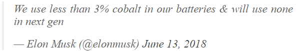 中國儲(chǔ)能網(wǎng)訊:近日,馬斯克在發(fā)布的推特中稱特斯拉的鈷使用量將從目前的3%降至0%。