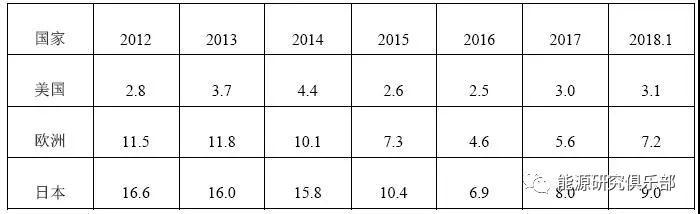 在天然氣價格方面,自從“頁巖革命”爆發(fā)以來,美國頁巖氣生產(chǎn)爆發(fā)式增長,使得美國迅速成為全球天然氣價格的洼地;東亞天然氣消費者則不得不承受國際天然氣市場長期存在的“東亞溢價”的負擔,東亞市場天然氣價格高時可達北美市場6倍左右。從2012年至2018年第一季度,歐洲天然氣價格相當于美國天然氣價格的1.8~4.1倍,東亞價格(以日本價格為基準)相當于美國的2.7~5.9倍,具體見表4。