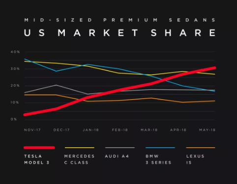 首先宣布了一個毫無懸念的消息:隨著產(chǎn)能和交付量的增加,Model 3已經(jīng)成為美國銷量最高的中級豪華車型。其實到4月份時,傳統(tǒng)陣營已經(jīng)僅剩奔馳C級在勉強(qiáng)支撐了,但遇到Model 3這種銷量多寡全由產(chǎn)能決定的選手,傳統(tǒng)陣營被屠榜是意料之中的事。