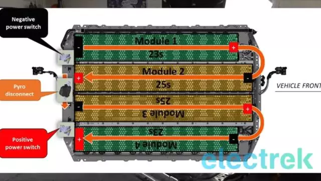 Model 3 的電池組由四個比例不同的模組構(gòu)成。其中兩個模組由 25 個電池單元構(gòu)成,另外兩個模組由 23 個電池單元構(gòu)成。每個電池單元有 46 個 2170 電芯,Model 3 總共有 4416 顆 2170 電芯。