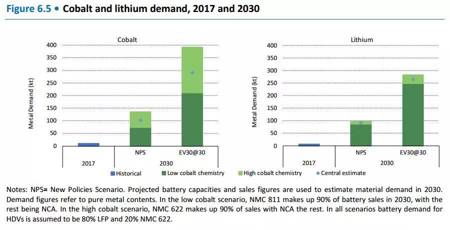 因此,用于電池生產(chǎn)的鈷和鋰的需求也會飆升。IEA預(yù)計,鈷的需求將在2030年提升10倍,年均需求將達(dá)到10.1萬噸。如果多個國家更加積極地推廣電動汽車,那么鈷的需求可能比現(xiàn)在增加25倍,達(dá)到年均29.1萬噸左右。