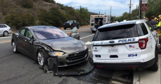 圖:這輛特斯拉轎車在美國(guó)加州拉古納海灘公路上與停泊的當(dāng)?shù)鼐囅嘧?,?dāng)時(shí)它的自動(dòng)駕駛儀(Autopilot)處于啟動(dòng)狀態(tài)