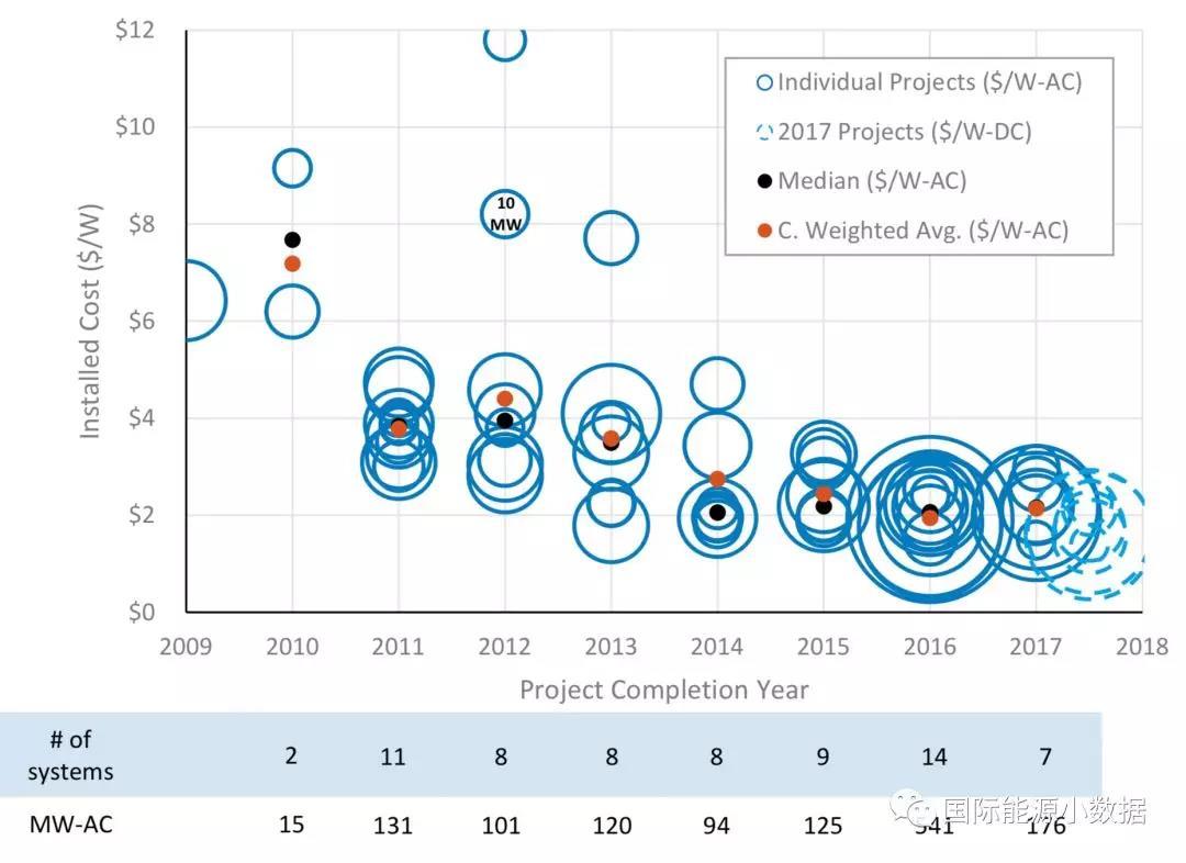此外,2017年68個(gè)大型公共事業(yè)級(jí)光伏項(xiàng)目的平均價(jià)格為2.16美元/瓦-AC(1.66美元/瓦-DC),與2014-2016年間項(xiàng)目平均價(jià)格相差無(wú)幾。