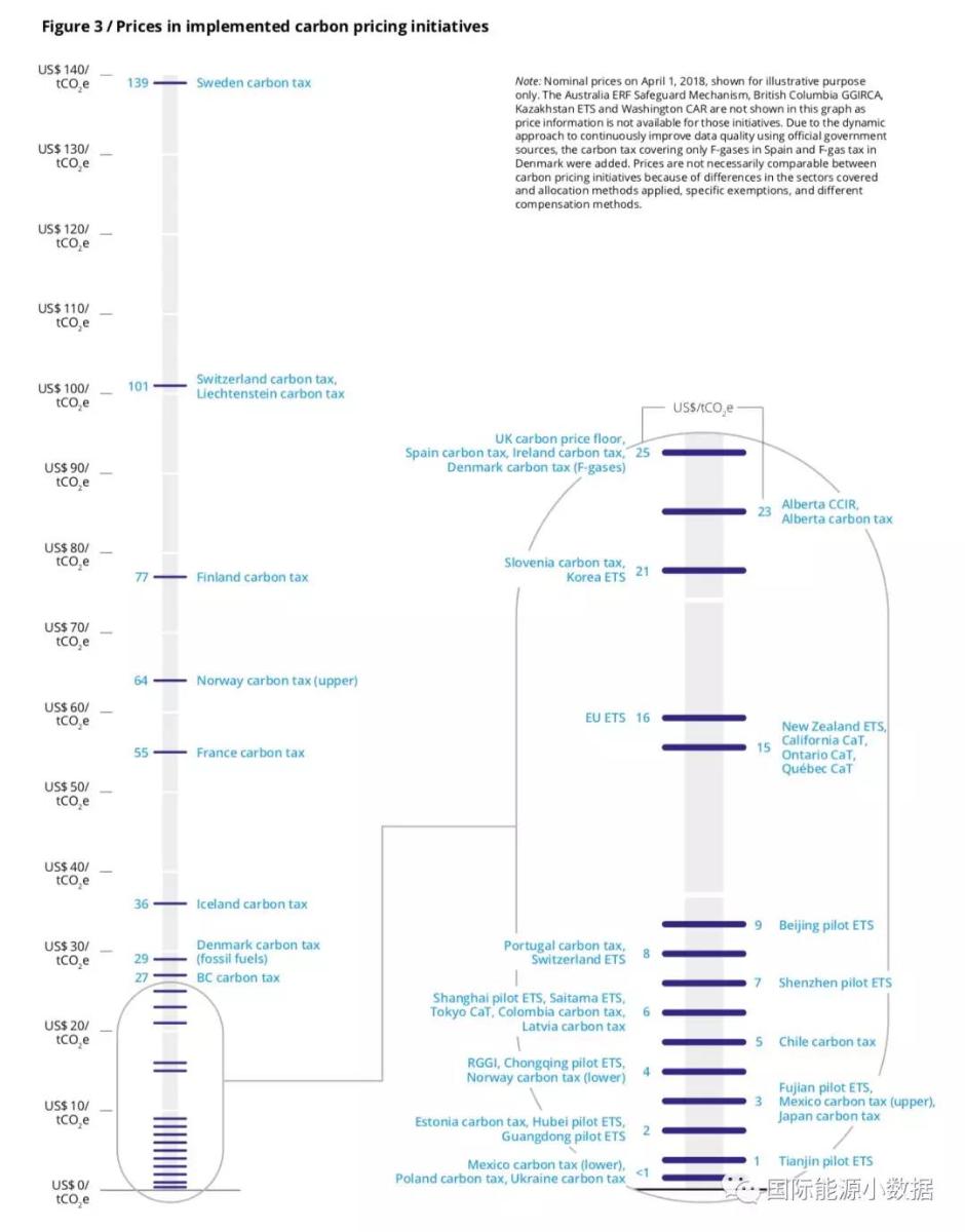 全球范圍內(nèi)碳價(jià)的區(qū)間在低于1美元/噸到139美元/噸之間,總起來說,碳價(jià)較高的國家均實(shí)施碳稅,而碳價(jià)較低的國家和地區(qū)則是碳交易市場(chǎng)(碳價(jià)低于10美元/噸的區(qū)域涵蓋46%的碳排放)。碳價(jià)從高到低的國家和地方如下——