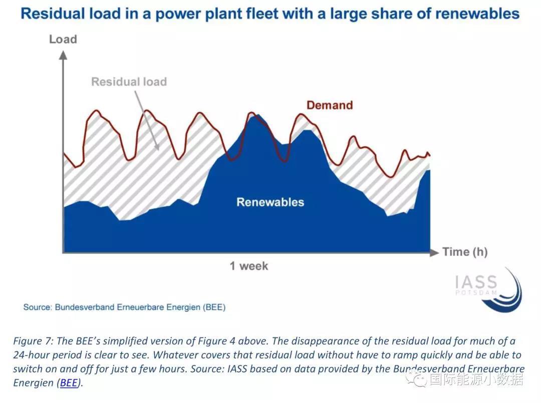 中國(guó)儲(chǔ)能網(wǎng)訊:隨著間歇性可再生能源的比例增加,電網(wǎng)的調(diào)度運(yùn)行需要解決新的問題。如下圖所示,由于可再生能源電源優(yōu)先上網(wǎng),在變動(dòng)的需求負(fù)荷曲線與間歇性可再生電源之間就是“剩余負(fù)荷”(residual load),需要由常規(guī)電廠來(lái)滿足。如果可再生能源發(fā)電超出負(fù)荷,那么就需要“棄風(fēng)”、“棄光”或者儲(chǔ)能。