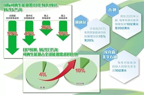不久前,挪威國家石油公司宣布,未來7年內(nèi)將投資2億美元用于發(fā)展可再生能源,還專門創(chuàng)立了一只規(guī)模可觀的可再生能源領域風投基金。意大利石油巨頭埃尼公司也已在全球多個國家開展太陽能項目,并計劃2020年之前在可再生能源領域投資5.5億歐元。此外,??松梨谑兔磕陮π履茉赐度氲难芯抠Y金高達10億美元。