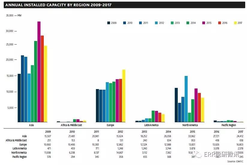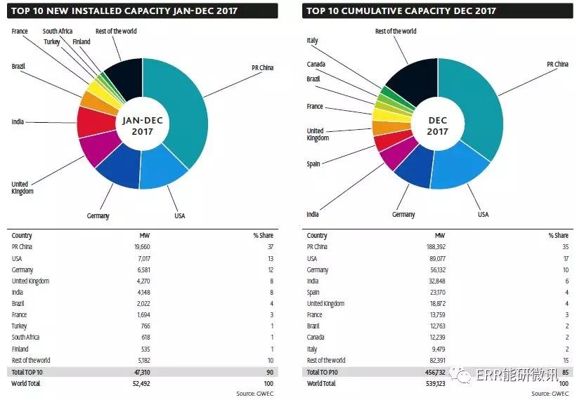 中國儲能網(wǎng)訊:2018年4月25日,全球風能理事會發(fā)布《全球風電報告2017》。17年,全球風電新增裝機容量保持50GW以上,歐洲、印度和離岸部門實現(xiàn)了歷史性增長。中國新增風電裝機容量有所回落,即19.66GW,為全球新增裝機容量的不到一半。2017年全球新增裝機容量為52,492MW,累計裝機容量達到539,123MW。與2016年新增裝機容量(54,642MW)相比,同比下滑3.8%;累計裝機容量與2016年底(487,279MW)相比增長11%。