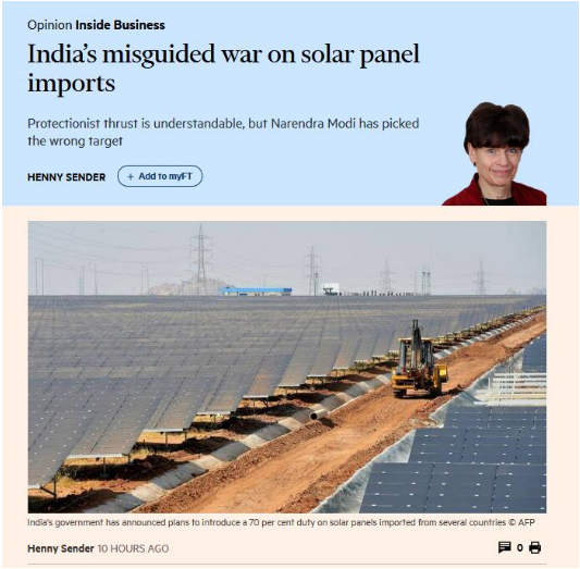 今年1月,莫迪政府卻宣布計(jì)劃對(duì)從多個(gè)國(guó)家進(jìn)口的太陽(yáng)能電池板征收70%的關(guān)稅,其實(shí)主要是針對(duì)中國(guó)。事實(shí)上,除少數(shù)例外,印度幾乎沒(méi)有自己的太陽(yáng)能電池板制造業(yè),而莫迪大肆吹噓的“印度制造”也并未真正出現(xiàn),因此印度采取最新的保護(hù)主義政策是可以理解的。