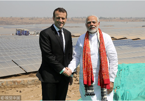 3月,國(guó)際太陽(yáng)能聯(lián)盟首屆峰會(huì)曾在德里舉行,莫迪與法國(guó)總統(tǒng)馬克龍出席@視覺(jué)中國(guó)