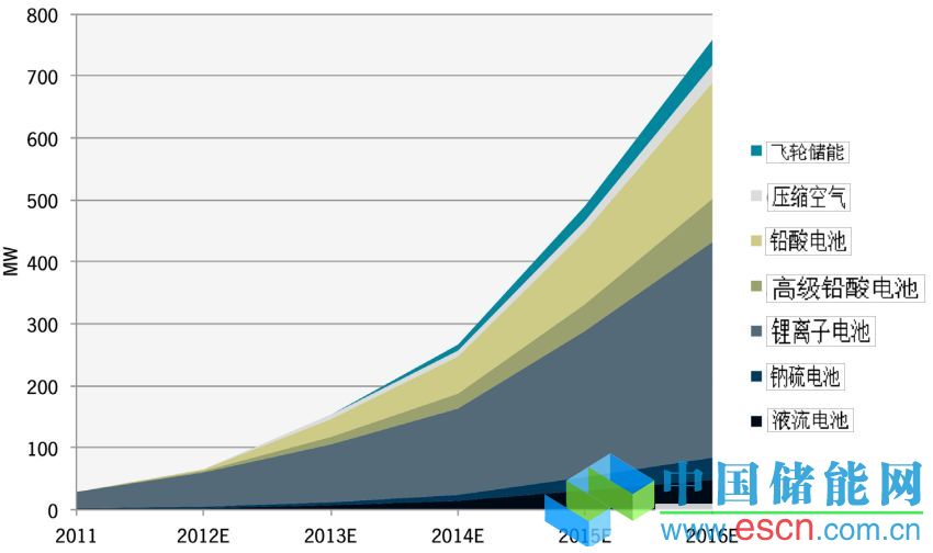 隨著中國(guó)開(kāi)始深入利用各種可再生能源,中國(guó)采用先進(jìn)儲(chǔ)能技術(shù)從開(kāi)始的幾近為零到2016年將升至700MW。下圖為中國(guó)到2016年全部?jī)?chǔ)能技術(shù)的裝機(jī)容量(抽水蓄能除外):