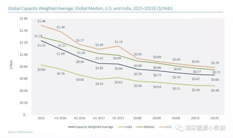 由于供需緊張,2017年下半年美國大型地面光伏項目的投資成本平均為1.14美元/瓦,比上半年的價格(1.09美元/瓦)略有上升。同樣,在印度2017年上半年的大型地面光伏項目的價格為0.62美元/瓦,也超過了上半年的平均價格(0.59美元/瓦)。但是放眼2022年,光伏系統(tǒng)成本會繼續(xù)下降:GTM預計美國的光伏系統(tǒng)投資成本為0.79美元/瓦;印度為0.48美元/瓦,全球加權平均為0.66美元/瓦。
