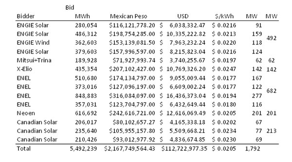 參與這次墨西哥的光伏項(xiàng)目競(jìng)標(biāo)的公司還有法國(guó)ENGIE,法國(guó)可再生能源公司Neoen,Mitsui 與Trina天合光能聯(lián)合競(jìng)標(biāo),阿特斯陽(yáng)光電力,西班牙太陽(yáng)能發(fā)電公司X-Elio他們給出平均報(bào)價(jià)為2.05美分/千瓦時(shí)。