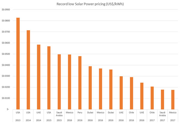 從2013年的最低競(jìng)標(biāo)價(jià)0.08美元/千瓦時(shí)到2017年的0.0177美元/千瓦時(shí),五年的時(shí)間,光伏電站最低價(jià)削減了77.88%;值得注意的是,這種“地板價(jià)”在2015年后集中在中東的阿拉伯聯(lián)合酋長(zhǎng)國(guó)和沙特阿拉伯,美洲的美國(guó)、 墨西哥和智利。