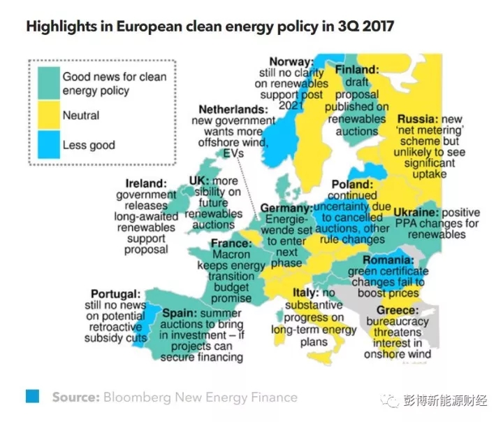 2017年第三季度,歐洲清潔能源投資的年同比增長(zhǎng)率