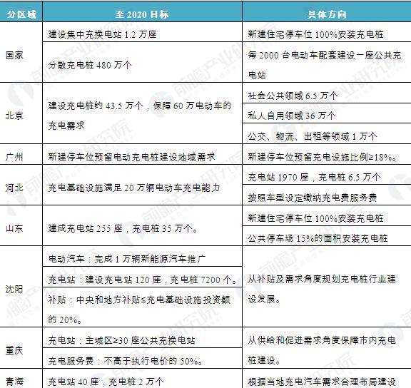 在國家政策和各省市新能源汽車產銷量的影響下,國內代表性地區(qū)紛紛制定出到2020年省市充電樁的建設目標,從國家層面至2020年集中建設交換電樁1.2萬座,布局于公共場所等的分散充電樁480萬個,其他省市均從電動汽車的推廣、充電樁的建設和充電服務費角度規(guī)劃充電樁的建設布局。