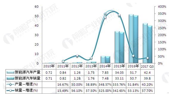 圖表3:2010-2016年中國新能源汽車產銷規(guī)模走勢圖(單位:萬輛)