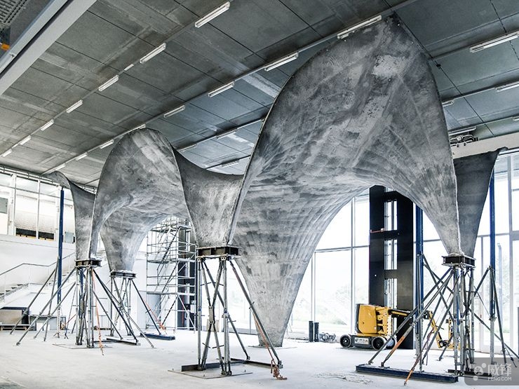 Block 研究小組和瑞士國家能力中心為該項(xiàng)目提供了一種算法,以確保在將濕混凝土的重量應(yīng)用于鋼網(wǎng)時,屋頂會達(dá)到理想的形狀。混凝土通過專門為這個項(xiàng)目開發(fā)的技術(shù)噴射到鋼網(wǎng)上。