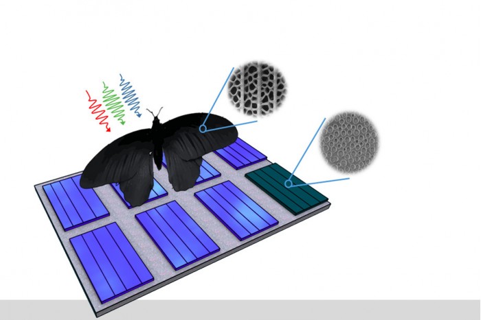 加州理工學(xué)院的Radwanul Siddique率領(lǐng)的小組通過計算機(jī)分析這些翅膀的3D模型,以便更好地了解它們的光學(xué)性質(zhì)。研究人員發(fā)現(xiàn)這些孔洞的尺寸、分布和形狀都是隨機(jī)的,但是其位置和順序?qū)τ谔岣呶展饽苄蕘碚f至關(guān)重要,接下來他們模仿黑蝴蝶翅膀的納米結(jié)構(gòu)模型,讓一些太陽能電池從硅樹脂中模仿出翅膀的鱗片狀納米孔結(jié)構(gòu)。然后在打印了一些具有類似結(jié)構(gòu)的太陽能面板進(jìn)行測試,與以前的結(jié)構(gòu)相比,光吸收效率增加了200%。
