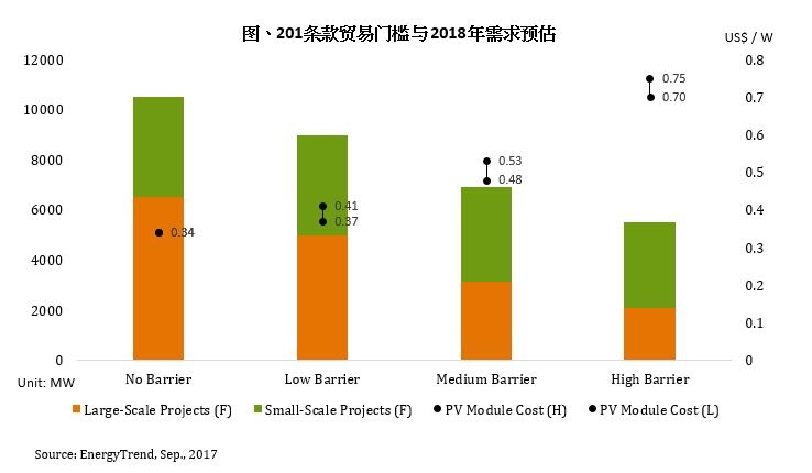 由于海外進口之低價組件主要供應美國的大型地面電站,貿(mào)易門檻之高低也將直接沖擊大型電站的需求。一旦美國決定對海外太陽能組件采取高門檻,組件成本將隨之飆高,預計美國2018年的市場需求將大幅下跌到5.5GW左右。后續(xù)須待2019年貿(mào)易門檻修正、美國本土產(chǎn)能陸續(xù)開出后才會逐漸回溫。