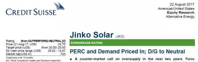 2017年8月22日,Credit Suisse(以下簡(jiǎn)稱(chēng)CS)也降低了晶科能源的評(píng)級(jí)。