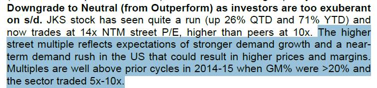 除了上述偏見(jiàn),有意思的是,CS雖然降了晶科的評(píng)級(jí),但將其目標(biāo)價(jià)從20提高到了25,也是讓我有些摸不到頭腦。