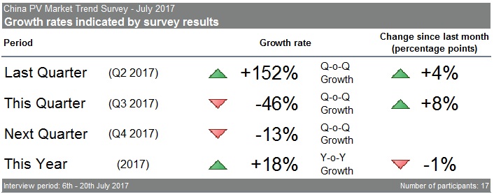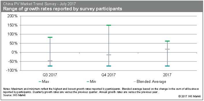 中國儲能網(wǎng)訊:IHS Markit最新的七月版《中國光伏市場趨勢調(diào)研》報告結(jié)果日前出爐,該報告顯示, 七月調(diào)研結(jié)果發(fā)現(xiàn),二季度出貨/裝機(jī)量相比上月調(diào)研結(jié)果更有4%提升,季度環(huán)比增量達(dá)152%; 大多數(shù)調(diào)研參與者表示三季度出貨量/裝機(jī)量會顯著下降。然而,總體來講,三季度的預(yù)期較上月調(diào)研結(jié)果提高了8個百分點(diǎn),相比二季度,三季度降幅為46%;調(diào)研結(jié)果顯示,因?yàn)槲磥碚咦呦虿幻鳎募径茸邉萜?。平均來看,本年度最后一個季度環(huán)比降幅達(dá)13%。