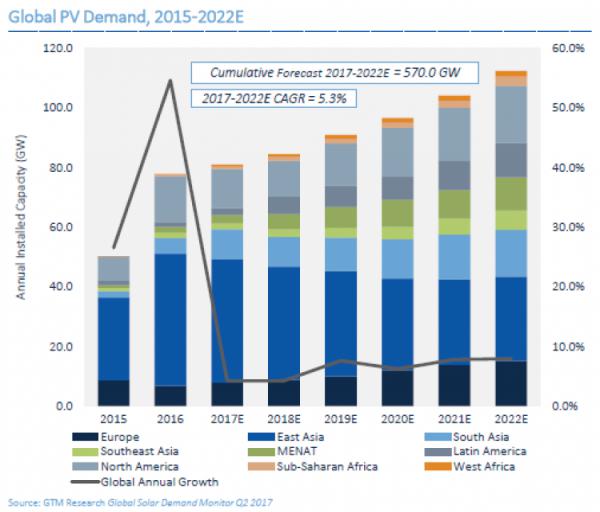 4月,GTM已預(yù)測2017年全球太陽能需求有望高達(dá)85吉瓦,但是在最新的報(bào)告中將上述數(shù)據(jù)下調(diào)至84.1吉瓦。
