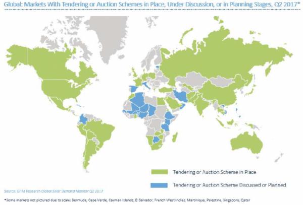 隨著更多國家采取拍賣機(jī)制來分配容量并降低關(guān)稅,而且通常不需要提供補(bǔ)貼,拍賣的數(shù)量預(yù)計(jì)繼續(xù)擴(kuò)張。已經(jīng)有48個(gè)國家采取拍賣策略,另外有27個(gè)市場正考慮或計(jì)劃這樣的政策。