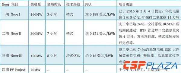 如圖所示,160MW的NoorI槽式光熱電站(3小時儲熱時長)已于2016年2月4日投運,電價為1.62迪拉姆/kWh,約合1.183人民幣/kWh;200MW的NoorII槽式光熱電站(7小時儲熱時長)的完工率已達76%;150MW的NoorIII塔式熔鹽光熱電站(8小時儲熱時長)的完工率也已達74%;今年4月,該項目第四階段(最后階段)的70MWNoorQuarzazateIV光伏電站正式動工,這標志著全部電站項目進入建設(shè)階段。