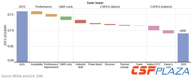 圖:塔式光熱電站2025年之前的成本下降曲線(xiàn)(數(shù)據(jù)來(lái)自IRENA 2016年發(fā)布的報(bào)告)