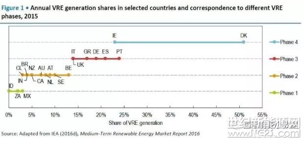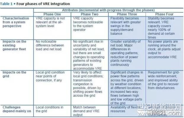 國(guó)際能源署發(fā)布報(bào)告Getting Wind and Sun onto the Grid,按照電網(wǎng)吸納間歇性可再生能源(主要是風(fēng)電、光伏)的比例劃分了4個(gè)階段: