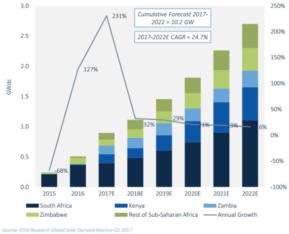 撒哈拉以南非洲對(duì)開(kāi)發(fā)商展現(xiàn)了10吉瓦的機(jī)會(huì)。2016年,南非、津巴布韋、肯尼亞和納米比亞至少投運(yùn)了10個(gè)公共事業(yè)規(guī)模項(xiàng)目。展望未來(lái),GTM預(yù)計(jì)2017年撒哈拉以南非洲將實(shí)現(xiàn)近1吉瓦的并網(wǎng)容量,并有可能到2022年新增太陽(yáng)能裝機(jī)量超10吉瓦。