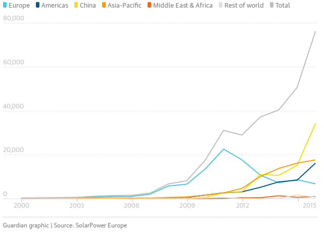 中國儲能網(wǎng)訊:在陽光充裕的地區(qū),太陽能被視為最易安裝和獲取的綠色能源。當(dāng)前全球光伏發(fā)電板總裝量已達(dá) 305 吉瓦左右,而在 2010 年的時(shí)候,這一數(shù)字還僅為 50 吉瓦?!缎l(wèi)報(bào)》的報(bào)道稱,中美兩國主導(dǎo)著該領(lǐng)域的發(fā)展,在 2016 年的增速都較 2015 年幾乎翻番;同期全球增量僅為 80 GW,2015 增量僅為 50 GW 。隨著各國政府對氣候變化憂慮的增長,太陽能產(chǎn)業(yè)也迎來了強(qiáng)勢的增長。