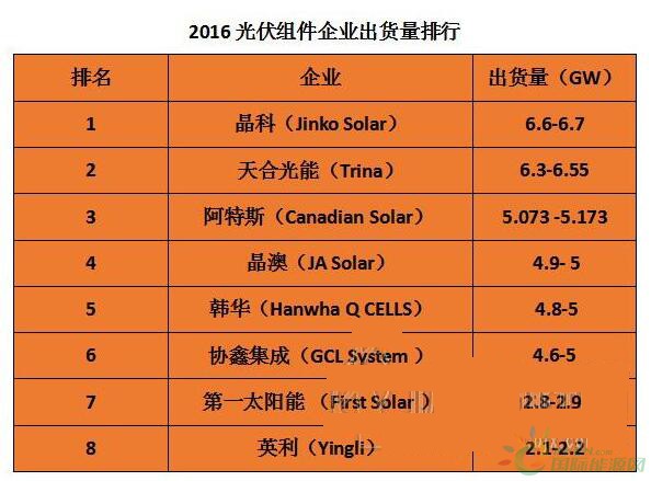 接下來排在第三位的是阿特斯,2016出貨量5.073~5.173GW;第四是晶澳太陽能4.9~5GW;韓華第五,出貨量4.8~5GW;協(xié)鑫集成第六,4.6~5GW;First Solar以2.8~2.9GW的出貨量來到了第七的位置。然而,2016年對于英利來說是令人失望的一年,排名進一步下滑。