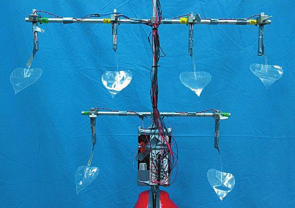 McCloskey實驗室的仿生樹風力發(fā)電裝置的原型不是真的樹,而是將十二個楊樹葉形狀的塑料皮瓣掛在 一個金屬棚架上,其莖葉內有小型特殊塑料條,當它被流動的空氣彎曲時,可以釋放出電荷,這個過程被稱為壓電效應。將楊樹葉子作為藍本是因為其扁平的葉柄可以迫使葉片規(guī)律地振蕩,通過柔性壓電片,充分利用風能,優(yōu)化發(fā)電效率。