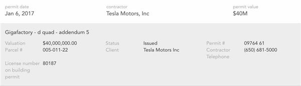作為一家施工許可證追蹤及承包商網(wǎng)站,Buildzoom去年向特斯拉發(fā)布了9份施工許可證,他們展示了部分重大的新項(xiàng)目,其中數(shù)個(gè)項(xiàng)目涉及金額巨大。Buildzoom的杰克·庫(kù)克森(Jack Cookson)稱,10.3億的施工價(jià)值的大部分在于對(duì)退出許可的變動(dòng)。