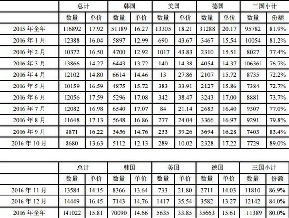 表 2016年全年中國多晶硅進(jìn)口情況(單位:噸、美元/千克)
