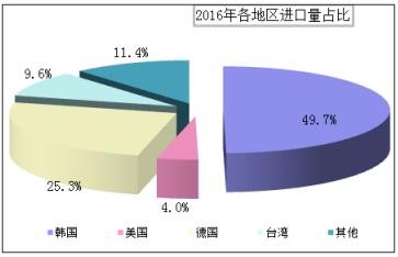 目前我國多晶硅主要進(jìn)口地區(qū)主要有韓國、德國、美國、臺灣,數(shù)據(jù)顯示,2016年全年,自韓、德、美、臺這四個進(jìn)口地區(qū)進(jìn)口量124940噸,占總進(jìn)口量的88.6%,進(jìn)口量占比分別為49.7%、25.3%、4.0%,9.6%,韓國居首位且占比巨大。由此表明,韓國由于受到2.4%的低反傾銷稅以及由此導(dǎo)致的韓國新增產(chǎn)能逐漸釋放影響,產(chǎn)量幾乎全部進(jìn)入中國市場。