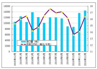 圖1 2015年12月-2016年12月多晶硅進(jìn)口量及進(jìn)口均價示意圖 數(shù)據(jù)來源:海關(guān)