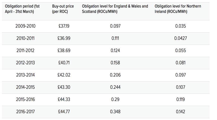 這里涉及到了一個市場供需關(guān)系問題。如果市場上的ROC供應(yīng)數(shù)量大于其強制購買要求,那么證書的價格必然會被打壓。所以ofgem會根據(jù)預(yù)測發(fā)電量上浮10%來設(shè)定ROC購買需求。這樣又不會造成ROC大量短缺,從而保證一定程度的市場競爭,穩(wěn)定證書價格。下表(引自ofgem)中間一欄描述了過去八年的ROC單位用電要求。我們可以看到這一標準從09年的0.097每兆瓦時上升至了16年的0.348每兆瓦時。反映了英國可再生能源發(fā)電比例的不斷上升。也側(cè)面說明了售電商在購買牌照方面的開銷在不斷增大。