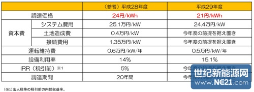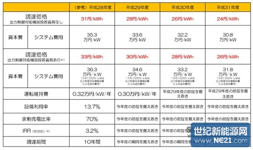 非住宅用系統(tǒng)的收購價格從本年度的24日元/kWh,降到了21日元/kWh。作為計算前提的成本和設(shè)備利用率,系統(tǒng)費用從25.1萬日元/kW降至24.4萬日元/kW,設(shè)備利用率則從14%提高到15.1%,成為了下調(diào)價格的依據(jù)。