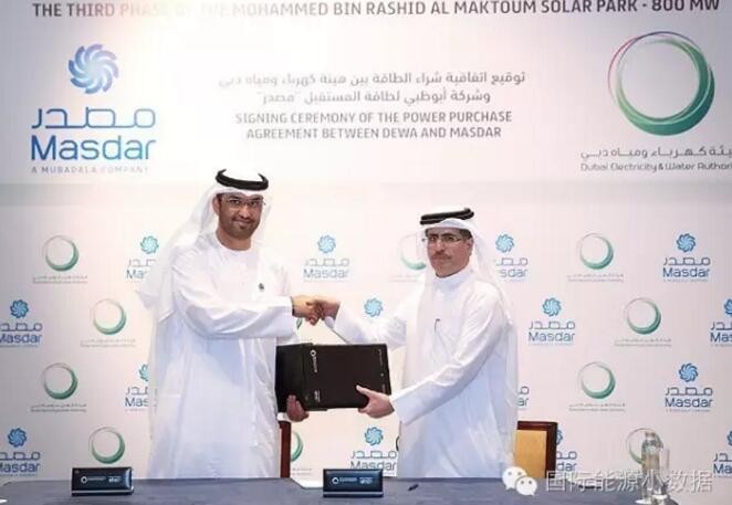 中國儲能網(wǎng)訊:2016年11月29日,迪拜電力和供水機(jī)構(gòu)(DEWA)與阿布扎比未來能源公司(Masdar)正式簽署了迪拜(Mohammedbin Rashid Al Maktoum Solar Park)光伏園第三期800兆瓦項(xiàng)目的購電協(xié)議,成交價(jià)格為0.299美分/千瓦時(shí),創(chuàng)全球歷史上最低的光伏價(jià)格。